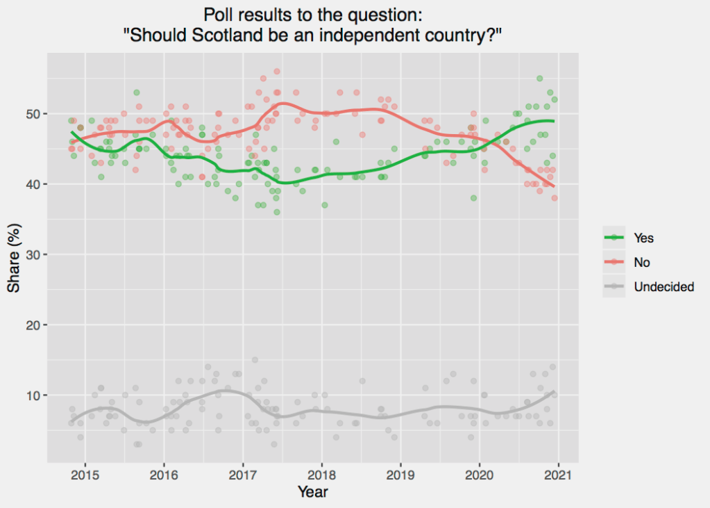 Yapılan bütün anketler İskoç kamuoyunun tarihinde olmadığı kadar yüksek oranlarda bağımsızlıktan yana olduğunu ve yalnızca SNP oylarının bile %50 seviyesine geldiğini gösteriyor.