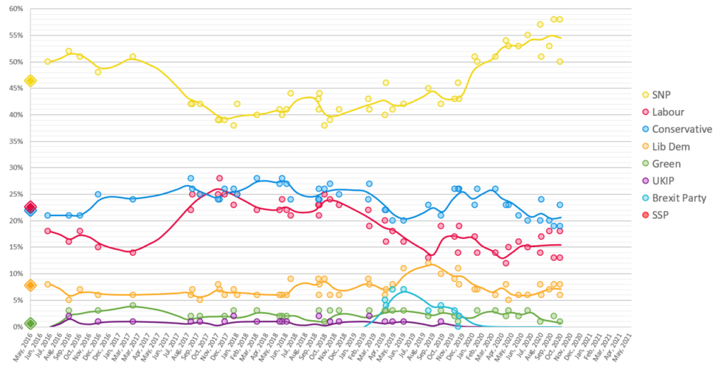 Öte yandan bağımsızlık yanlısı SNP, özellikle şu anki lideri İskoçya başbakanı Nicola Sturgeon Parti’nin başına geçtikten sonra, hem eski İşçi Partisi seçmenlerinden merkeze yakın olanların desteğini alarak hem de Covid sürecini merkezi hükümete göre oransal olarak çok daha az vaka ve ölüm sayılarıyla yöneterek çok büyük bir hızla SNP’nin bölgedeki oyunu ve desteğini arttırdı.