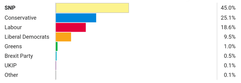 İskoçya’yı kalesi olarak gören İşçi Partisi, hem Brexit öncesi hem de Brexit’ten bugüne kadar gelen süreçte İskoçya’da çok başarısız bir politika izledi. Parti adayları, yöneticileri ve politikaları İskoç toplumu tarafından beğenilmedi. Daha 10 yıl önce İşçi Partisi’nin %42 oy aldığı, bir zamanların İşçi Partisi kalesi olan İskoçya’da 2019 seçimlerinde İşçi Partisi oyların ancak %9’unu alarak tarihinde İskoçya’da aldığı en düşük oy oranını elde etti.